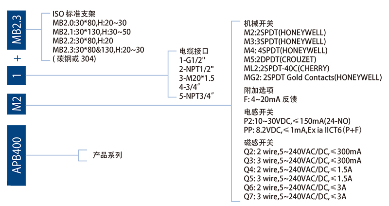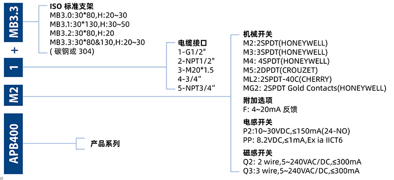 阀门防爆限位开关是工业自动化不可缺少的组成部分,它是构成现场环境与控制室之间的桥梁。APB400系列限位开关是一种回传型的指示设备,是为配合阀门与NAMUR回转型执行器使用而设计,在高温,高寒,潮湿,脏污,腐蚀,易爆等各种复杂工业环境中都有稳定的表现,方便现场的使用与选择。为满足现场使用环境的需求壳体材质分为:压铸铝合金。压铸铝合金回讯器产品表面为铬酸盐聚酯喷涂处理。防爆等级:Ex db IIC T6 Gb。